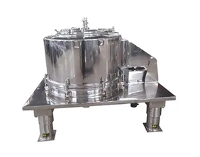 PD系列吊袋離心機(jī)結(jié)合國(guó)情自行設(shè)計(jì)制造的新型離心機(jī),其驅(qū)動(dòng)電機(jī)既可采用離合器啟動(dòng),也可由變頻調(diào)速系統(tǒng)控制,啟動(dòng)平穩(wěn),通過三角帶將動(dòng)力傳遞給轉(zhuǎn)鼓,帶動(dòng)轉(zhuǎn)鼓使轉(zhuǎn)鼓自身軸線高速旋轉(zhuǎn),形成離心力場(chǎng),待分離的物料經(jīng)上部加料管進(jìn)入高速旋轉(zhuǎn)的轉(zhuǎn)鼓內(nèi),在離心機(jī)力場(chǎng)作用下,物料均布在轉(zhuǎn)鼓壁上進(jìn)行離心過程,液相透過固相物料及濾袋的縫隙,經(jīng)轉(zhuǎn)鼓孔甩至機(jī)殼空腔,從底盤出液口排出,固相物料則被截留在濾袋內(nèi)。停機(jī)后,開啟機(jī)蓋(借助特殊設(shè)計(jì)的平衡助力裝置),拔出蘭蓋鎖緊栓,用特制的吊具將濾餅吊出機(jī)外設(shè)定地點(diǎn)卸料,即完成一個(gè)工作循環(huán)。機(jī)蓋上配有洗滌管,可以對(duì)物料進(jìn)行洗滌。